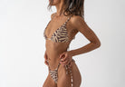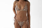 Our most minimal cut- designed for confident tanning, swimming, or lounging. Featuring fully adjustable tie sides and a flattering low rise, this style is made from our signature recycled Repreve® fabric in the buttery yellow and chocolate tones of our Coral Sands print.